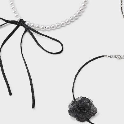 Five-piece choker necklace set from Wild Fableā¢. Includes four necklaces with lobster-claw clasp closures ā a black twisted cord necklace with a textured fabric rose charm, a black sheer ribbon necklace, a silver-tone ball chain necklace and a clear crystal necklace. Also includes a white faux-pearl necklace that fastens at the back with black bow ties. Four-inch extender chains offer customizable length.