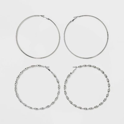 Hoop earring set from Wild Fable™. Includes two pairs of 4-inch circular earrings — one with a smooth wire silhouette and the other with a twisted wire design. Made of metal with a leverback closure for secure wear.