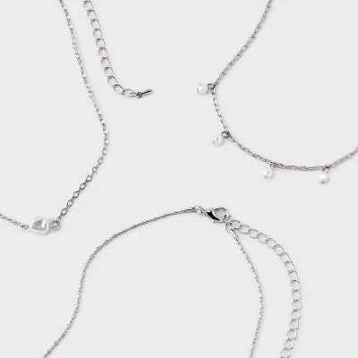 Five-piece choker necklace set from Wild Fable⢠in silver and white tones. Includes four silver chain necklaces, three with charms, and one white bead necklace with a bow. Extender chains offer easy length customization. Lobster claw clasp closures provide a snug fit.
