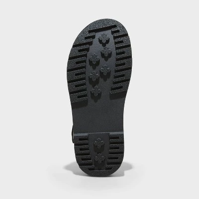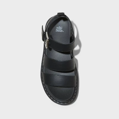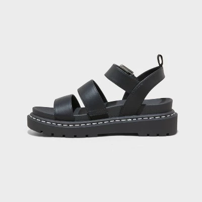 Black Thalia lug slide sandals from Wild Fable⢠with a contoured footbed and two-inch platform heel. Feature a faux-leather vamp with two bands and an adjustable ankle strap with a silver-tone buckle. Made of plastic with an open round-toe, white-stitched detailing on the midsole as well as a comfortable lug outsole.