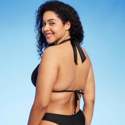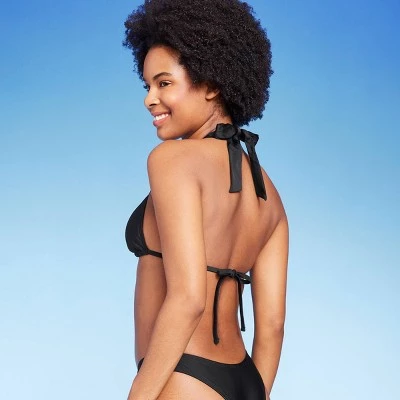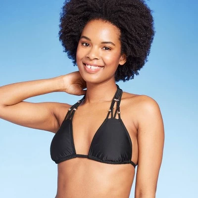 Black triangle bikini top from Wild Fable™ with a matching macrame design and shiny silver beads on the shoulders. Made from soft fabric with spandex and full lining for stretchy comfort in and out of the water. Back and behind-neck ties finish off the stylish look with a customizable fit.