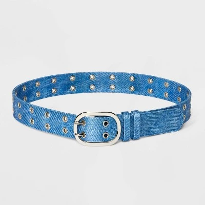 Denim blue belt from Wild Fable™ made of 100% recycled polyester. Designed with an oval-shaped double-pronged buckle in silver-tone and two rows of shiny grommets across the length. Features 36-inch length with double belt loops.