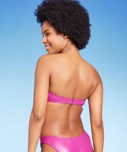 Pink bandeau bikini top from Wild Fable™ made from faux leather. Soft and stretchy fabric construction with lining for comfort in and out of the water. Back hook-and-loop fastener offers a secure fit. Adjustable straps help you change the look, and it’s designed with removable cups for customizable coverage.
