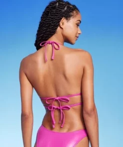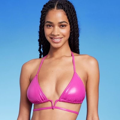 Pink faux-leather triangle bikini top from Wild Fable™ with a V-shaped underwire accent on the front and trailing back ties. Made from soft fabric with spandex and soft lining for stretchy comfort in and out of the water. Removable cups plus back and behind-neck ties finish off the stylish look with a customizable fit.