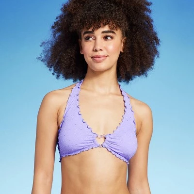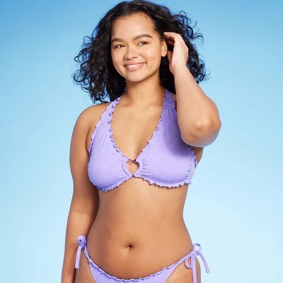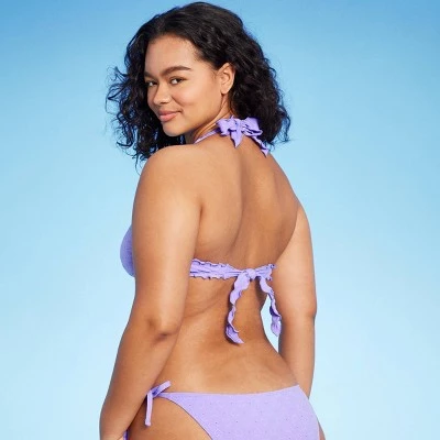 Eyelet bikini top from Wild Fable™ features allover hearts pattern. Designed with lettuce trim, this halter-neck bikini top features a heart accent and keyhole at the center of the bust. Made from soft and stretchy fabric with lining for comfort all through your beach activities. Removable cups for customizable coverage.