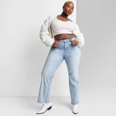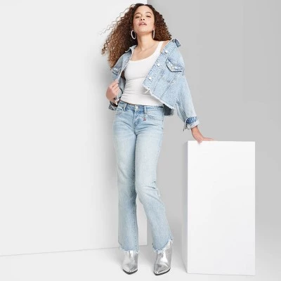 Medium-wash bootcut jeans from Wild Fable™ with a full-length silhouette and destroyed hems with fringed accents. Crafted from cotton-rich denim fabric with spandex for comfortable wear that moves with you. Tailored in a bootcut-leg silhouette with a regular fit. Belt-loop waistband with a zip fly and button fastening offers a secure fit. Classic five-pocket design completes the functional look.