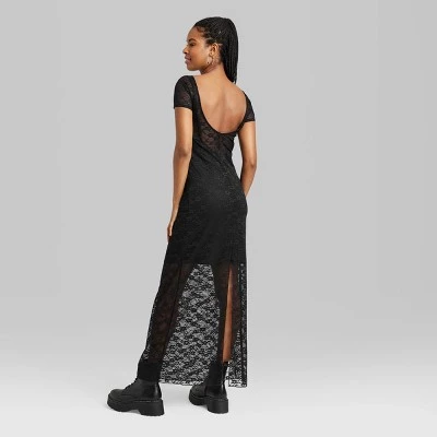 Lace maxi dress from Wild Fable™ in a solid hue with short sleeves and a plunging scoop neckline at the back. Made of midweight fabric with spandex for flexible comfort that moves with you. Features a recycled polyester partial lining and a long slit down the center back. Pullover style completes the look and makes it easy to put on and take off.