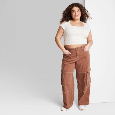 Mid-rise baggy cargo utility jeans from Wild Fable™ in brown wash. Crafted from cotton-rich denim fabric with contrast-stitched accents. Tailored in a wide-leg silhouette with a relaxed fit. Belt-loop waistband with a zip fly and button fastening offers a secure fit. Cargo pockets on the legs plus multiple front and back pockets complete the functional look.