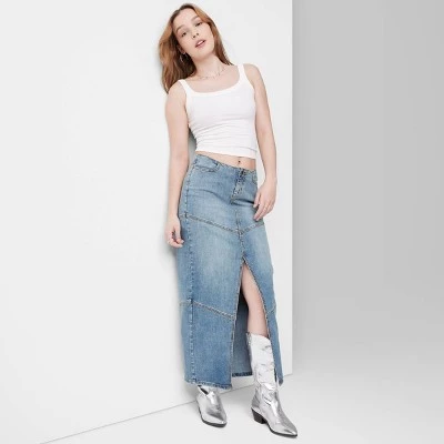 Chevron denim skirt from Wild Fable™ in a medium wash with a maxi length and a long slit down the center front. Made of midweight cotton-rich fabric with stretch for flexible comfort. Tailored in a regular fit with a mid-rise waist and zip fly with button closure. Front pockets complete the design with functional flair.