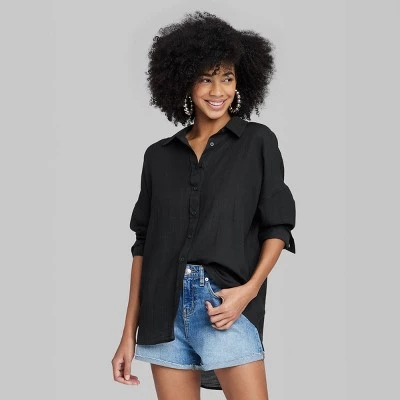 Slub button-down shirt from Wild Fable™ made from cotton-rich fabric. Designed in an oversized fit with a collared neckline, full front button-down closure and long dolman sleeves with buttoned cuffs. Long-length shirttail hem completes the stylish look.