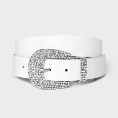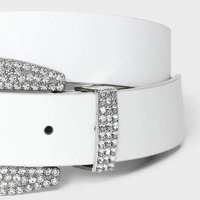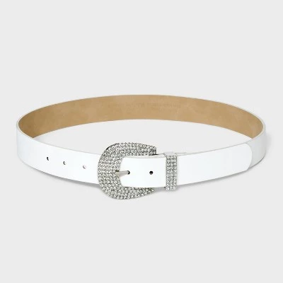 White faux-leather belt from Wild Fable™. Designed with a rhinestone-studded buckle closure and belt loop. Features 36-inch length with multiple holes for a customizable fit.