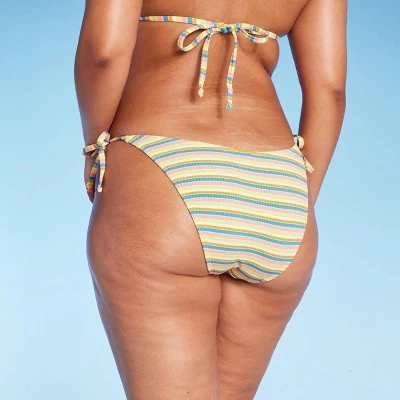 Reversible ribbed bikini bottom from Wild Fable™ with a striped design in blue, green, pink, brown, and white hues. Made from soft fabric with four-way stretch and full lining for flexible comfort in and out of the water. Features extra-cheeky coverage and a low-rise, extra-high-leg silhouette with elastic at leg openings. Side string ties complete the look with a customizable fit.