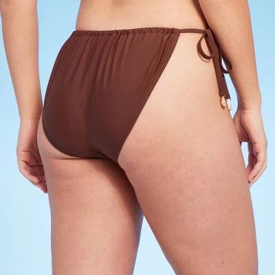 Solid-color bikini bottom from Wild Fable™ with shell charm-tipped string ties. Made from soft fabric with spandex and comfy lining for flexible comfort in and out of the water. Features a low-rise, high-leg silhouette. Tunnel ties on the sides complete the look with a customizable fit and adjustable coverage.