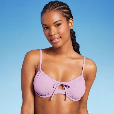 Shirred Lurex bikini top from Wild Fable™ in a solid hue. Made from soft fabric with spandex and full lining for stretchy comfort in and out of the water. Metallic fibers add a touch of shine. Removable cups offer customizable coverage. Front bow detail brings a sweet touch. Adjustable straps help you find the right fit. Sizes XXS-XL have removable pads, and sizes 14-26 have sewn in cups.
