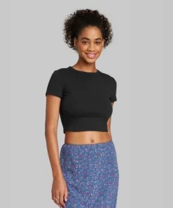 Two-pack of short-sleeve T-shirts from Wild Fable™. Tailored in a fitted silhouette with a cropped length that hits above the waist. Crafted from a soft cotton-blend fabric with a hint of spandex for stretchy, cool comfort. Features crewneck style and solid hues.