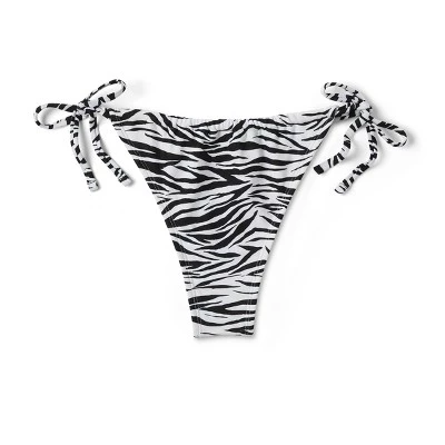Zebra-print bikini bottom from Wild Fable™ in black and white. Made of a soft fabric with added spandex and elastic at leg openings for comfortable wear in and out of the water. Tailored in a low-rise, ultra-high-leg, ultra-cheeky silhouette. Side string ties complete the look with a customizable fit and coverage.